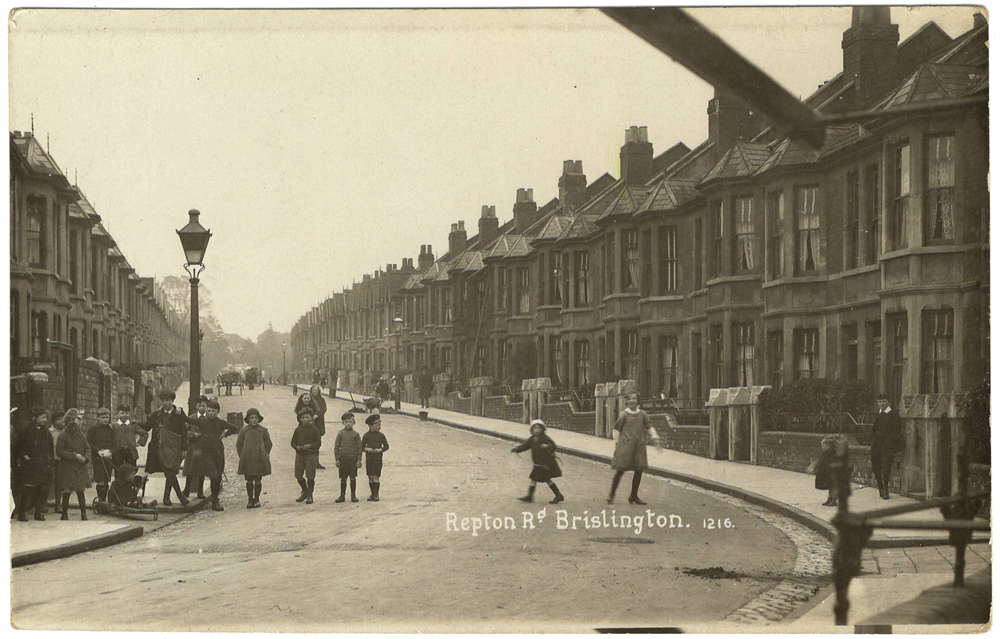 The photograph is believed to have been taken by Fred Viner, and the postcard published by Viner & Co., Publishers. Bath. The front carries the title "Repton Rd. Brislington." and the reference number "1216". See our notes for more information about this photographer and postcard publisher, and their work in Brislington.