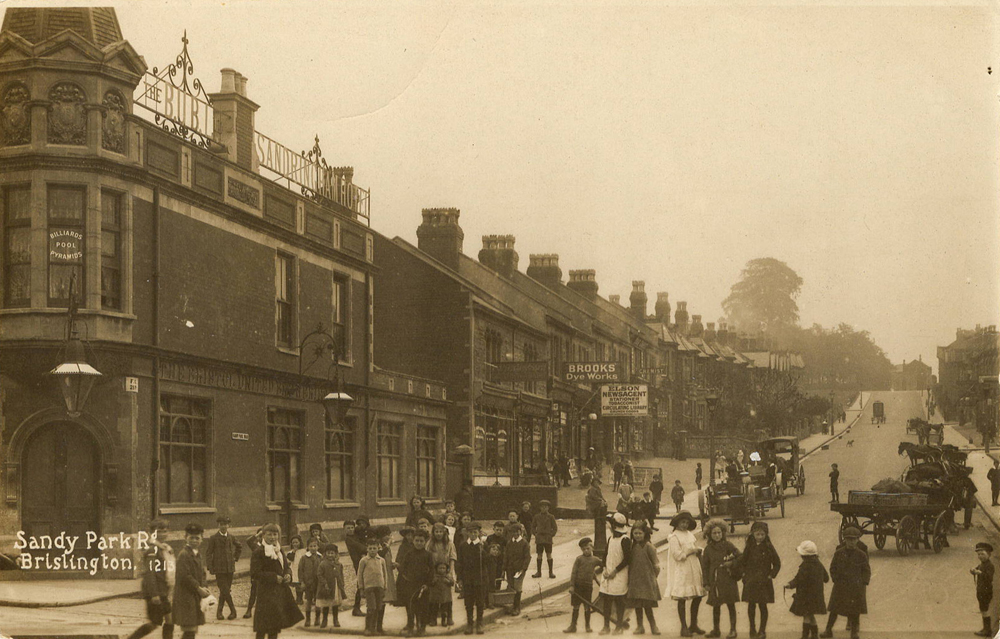 A particularly lively scene with several dozen children in the foreground, has been captured in this view looking uphill on Sandy Park Road. An advert on the first storey window of The Sandringham Hotel on the left promotes "Billiards Pool Pyramids". Other signs above shops on the street include a Chemist, Brooks Dye Works, and "Elson Newsagent Stationer Tobacconist Circulating Library".