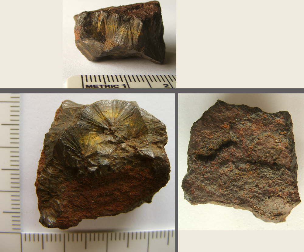 This piece of botryoidal (grapelike) haematite shows the crystalline structure of radiating needles that give this form of iron ore its distinctive shape. Pieces similar to this have been found in various locations around Brislington, indicating apparently widespread mining and or ironworking sites.