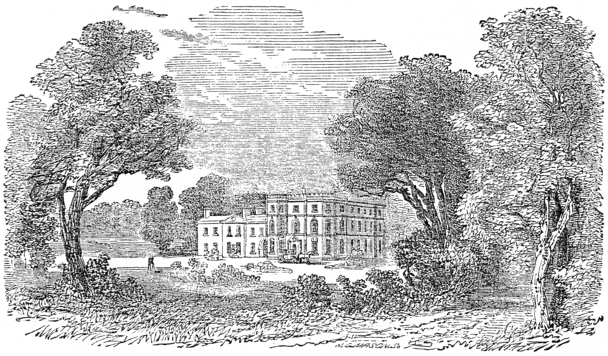 At the time of writing, this building is called Arnos Manor Hotel. This picture by N G Mason, shows two clearly distinct phases of construction at Arno's Court while was it was still a private house (e.g. some time before 1851 when it became a Roman Catholic convent). The artist was looking to the west, and the tree-lined track in the foreground is most likely to be the Bath Road (A4).