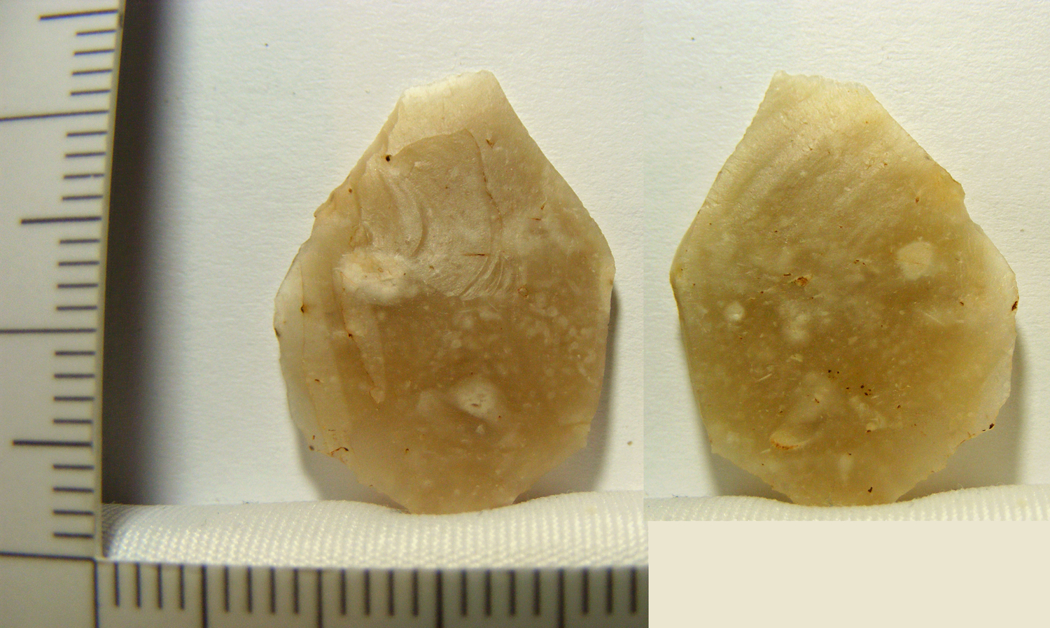 Its size and shape was immediately reminiscent of a Neolithic arrowhead, but the similarity was disregarded because this flake lacks a pointed tip. Naturally, many arrowheads lose their tips during use, but this flake is so thin toward that place that it could never have had a sharp point.
