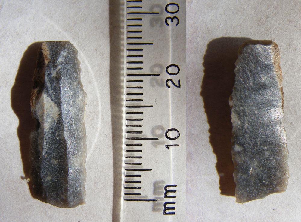 The long, roughly parallel ridges on one side show that this flint blade was knapped from a prepared flint core. It's small to medium sized, at 25mm in length.