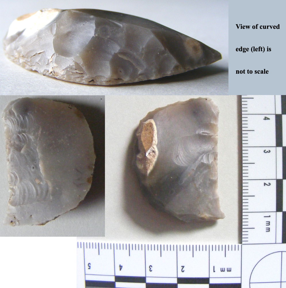This Neolithic flint tool was unearthed in a back garden during the 2003 Time Team Big Dig, and was mentioned on one of the weekend's shows. Both sides of the sharp edge bear the scars where many shallow flakes have been detached by wear during use. The curved edge is up to 9mm in thickness, and was carefully knapped to provide an even surface.