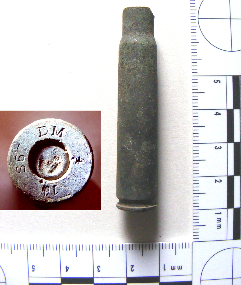 This necked, rimless cartridge is 57mm long with a mouth of 8mm, and has been fired.
