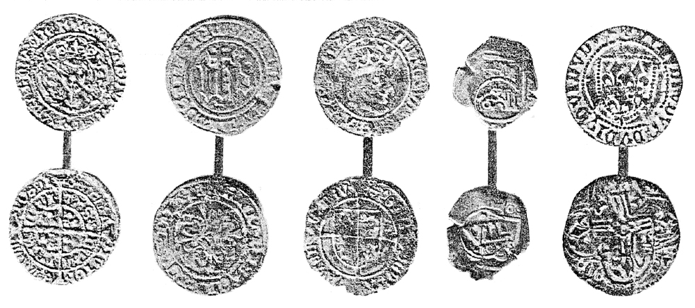 The items illustrated are, from left to right: Edward IV halfgroat, a French jetton or counter (1461-1497), Henry VII halfgroat, a coin said to be from Portugal, and another medieval French jetton.