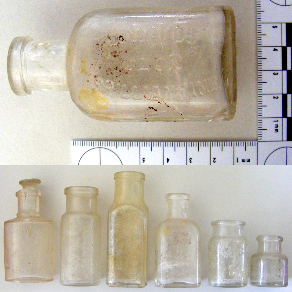 This collection of clear glass bottles was found apparently dumped behind an old advertising hoarding. Publications bearing advertisements for some of these products (e.g. Edwards and Bismag) date to the early 1920s.
