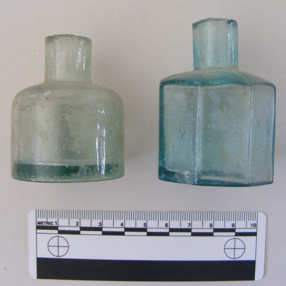 These two glass bottles are thought to have contained ink for fountain pens etc. The