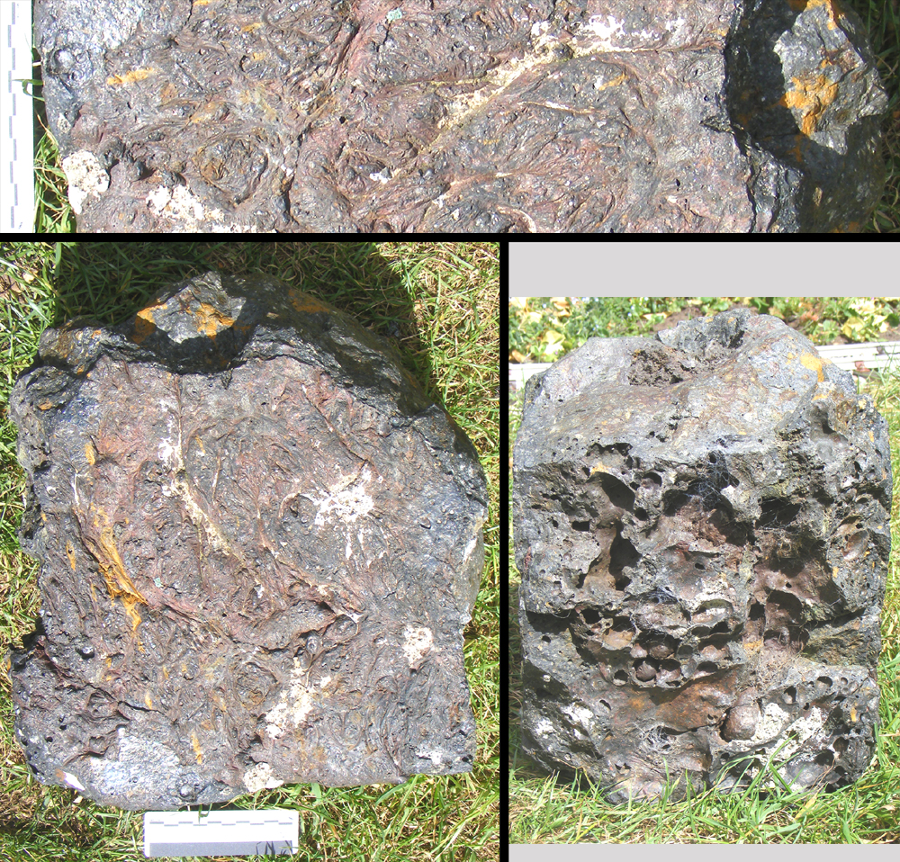 This is a large piece of a cast block of copper slag dating to around 1760 (the white and brown markings are superficial and recent). This block shows characteristic bubbling and swirls where the molten metal cooled, as well as patches of iridescense (top left of close-up, bottom left of front). Although damaged around the edges, its parallel front and back allow measurement of its width (pictured with the bubbling), which varies between 195mm 200mm, indicating an original specification of a maximum 8 inches.