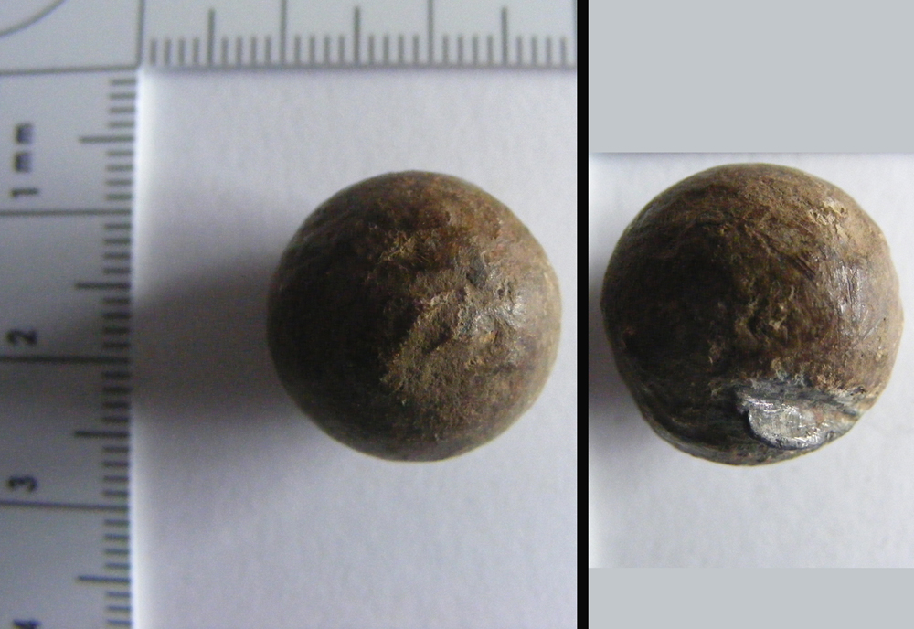 This lead sphere may have been a musket ball and, if so, it has probably been fired as embedded in its surface is a thin strip of silvery metal. However, the strip of metal may have been deliberately inserted when the object was made, and it may once have been longer with, perhaps a hole from which it could be hung, as a weight.