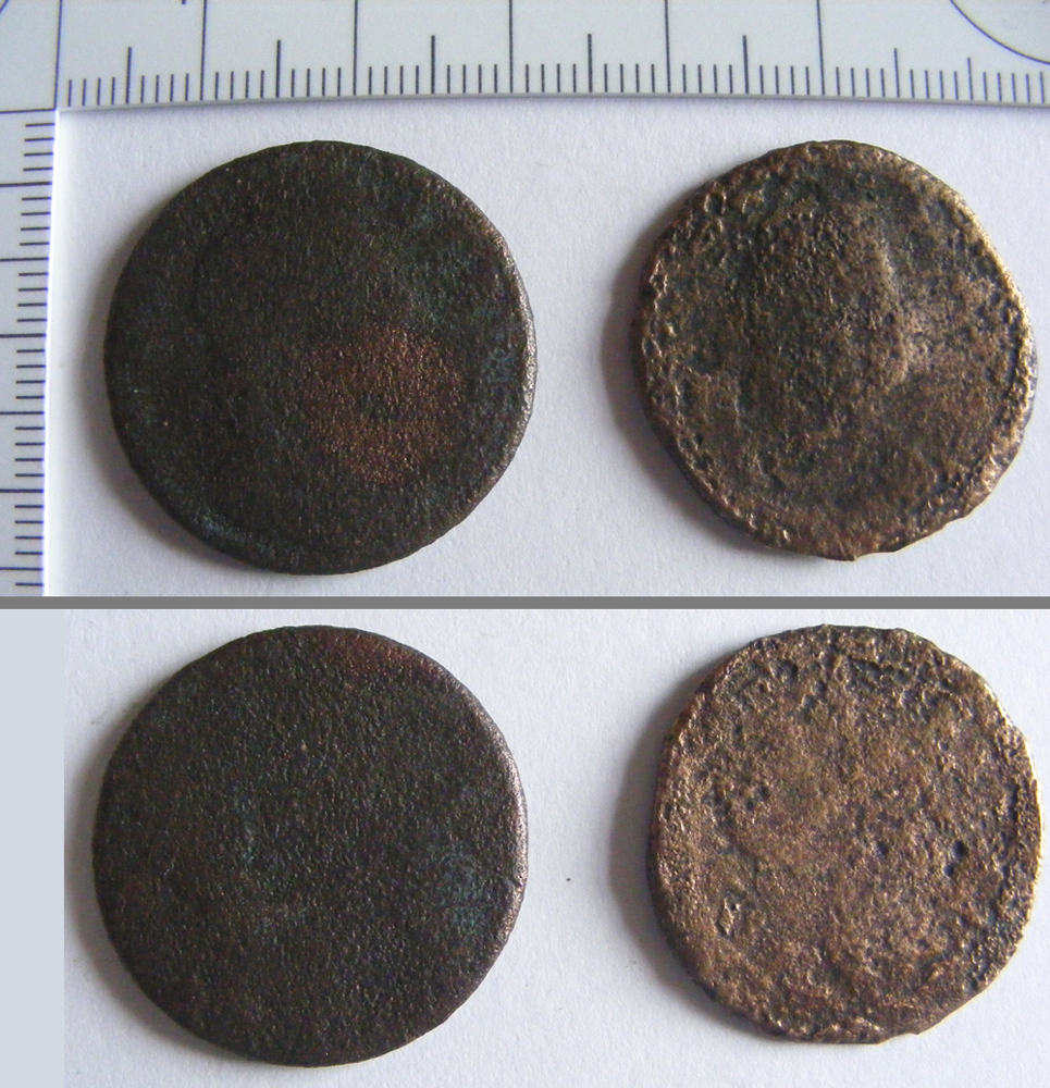 The right-hand coin has been cleaned using a vinegar-based (acid) solution, which has stripped away the surface layer and exposed bare metal - giving it a characteristic brightness. This home experiment was, thankfully, only performed after the coin had been identified and deemed expendable. This sort of chemical cleaning is essentially destructive and drastically reduces the value of artefacts - both in terms of archaeological evidence as well as financially (a valuable coin may be ruined and made worthless by such well-meant efforts). The cleaning and conservation of metal objects is a delicate art, and professionals spend a long time learning how to do it without damaging the artefacts. If in doubt, leave it dirty - and safe.