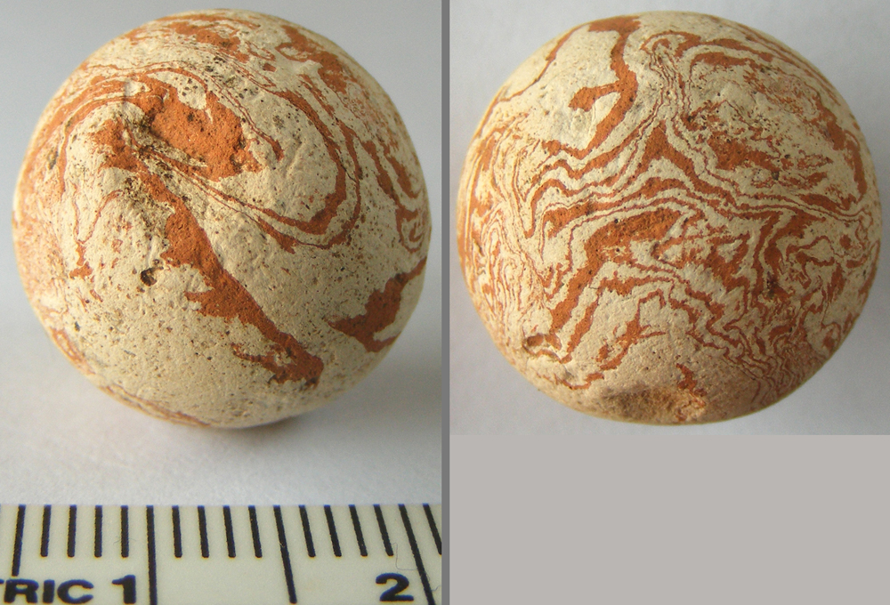 Having seen the exhibit here, archaeologist Noel Boothroyd kindly contacted us, saying the sphere "...definitely is a marble, we found quite a few on domestic sites in Stoke, probably by-products (unofficial?) of the pottery industry (or in this case clay pipe factory)."