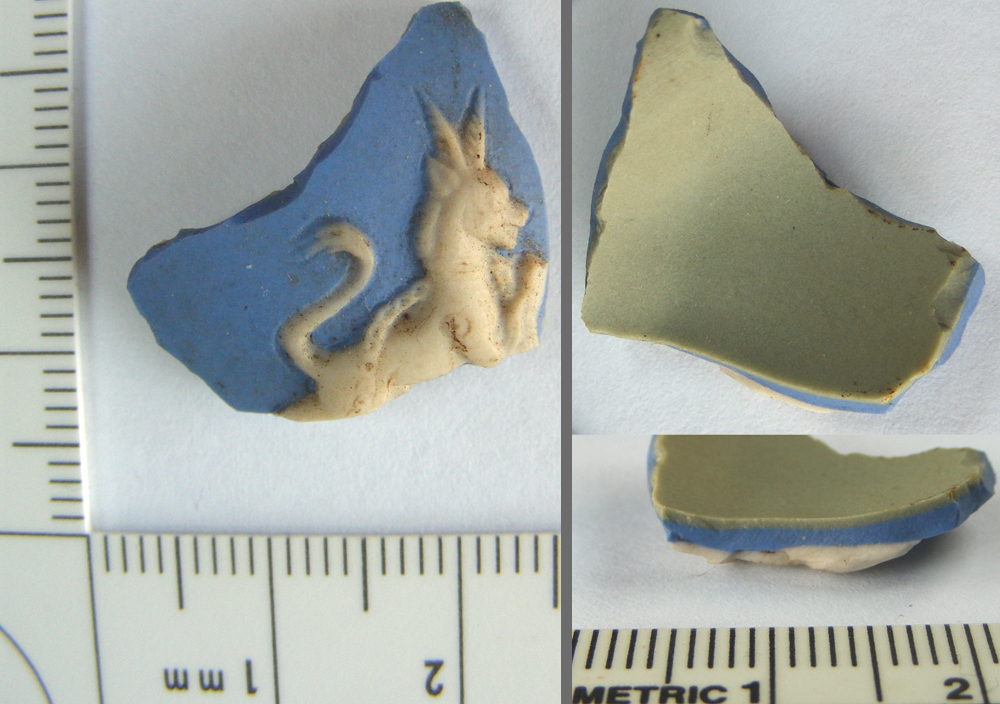 Usually associated with the pottery manufacturer Wedgewood, this stoneware has a characteristic matte surface on which is overlaid with an embossed decoration (usually white). This sherd may be from a small ornamental vase bearing a coat of arms depicting an antelope (such as that of Manchester City Council).