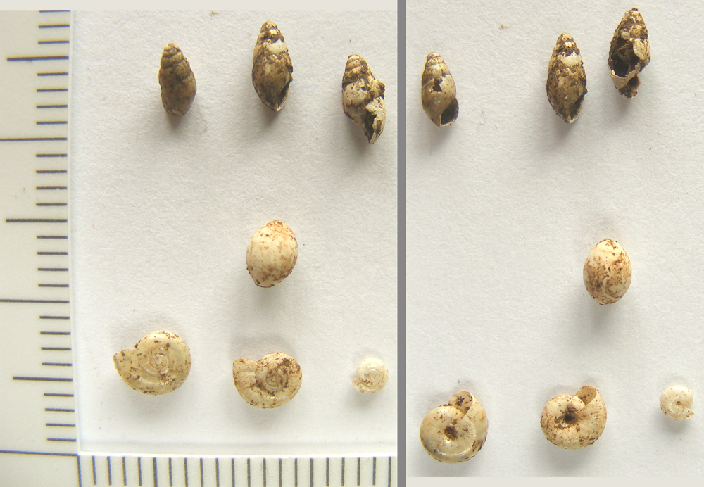 Although small, remains such as snail shells can be identified and, because different types live in different habitats, they can tell us about the big picture - about the environment itself. The three long, narrow shells were found in a layer of turf, while the three circular shells were found in a void left by a decayed tree root or buried log. The central oval was found in the same void and is an egg case. All these tiny invertebrate remains are extremely fragile, and demand careful handling and storage.