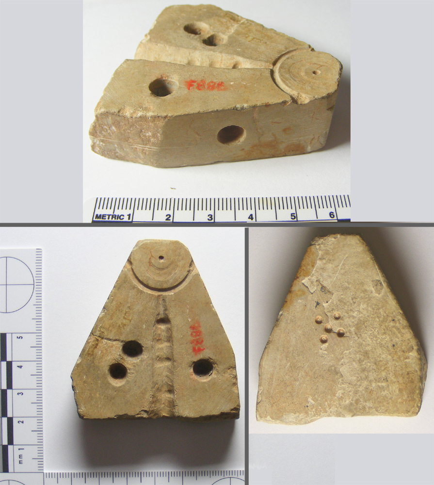 This stone mould is probably part of a larger composite reusable mould which, when assembled, appears to be for making a circular ring. The large holes are where the separate elements of the mould were joined together with pegs (material unknown). The mould is thought to be made from white lias limestone. The casting process includes the use of a crucible, using metals with a low enough melting point, with the molten metal being poured into the mould via the sprue (conical shaped groove) and hand finished.