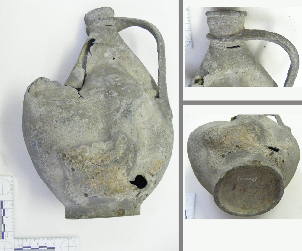 This is one of three beautiful and rare Roman survivals found 8.5m (28 ft) to 10m (32 ft) deep in the well amongst other material. They are made from pewter which is a metallic material, the composition is lead 62.5%, tin 36%, antimony 0.8%, "earthy matter" and possible loss 0.7%. The powdery white patches on the surface is lead oxide from the lead/tin alloy. Drinking from these could have had serious health implications; ie lead poisoning.
