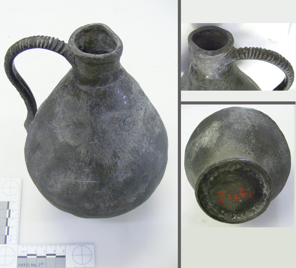 This is one of three beautiful and rare Roman survivals found 8.5m (28 ft) to 10m (32 ft) deep in the well amongst other material. They are made from pewter which is a metallic material, the composition is lead 62.5%, tin 36%, antimony 0.8%, "earthy matter" and possible loss 0.7%. The powdery white patches on the surface is lead oxide from the lead/tin alloy. Drinking from these could have had serious health implications; ie lead poisoning.