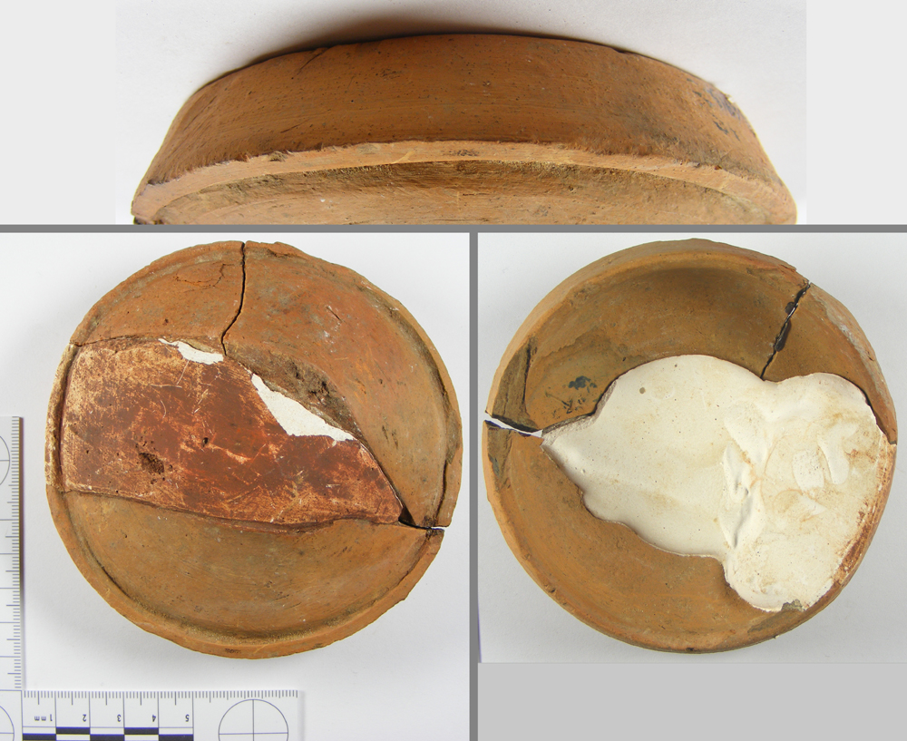 This exhibit is probably Roman Oxfordshire red ware, and has been identified as the base of a goblet-shaped cup; a wide base narrowing to a short stem and then bowling out to form the cup part. It is in three pieces which fit beautifully together but has been crudely reconstructed (with the white material) at some time in the 20th century.