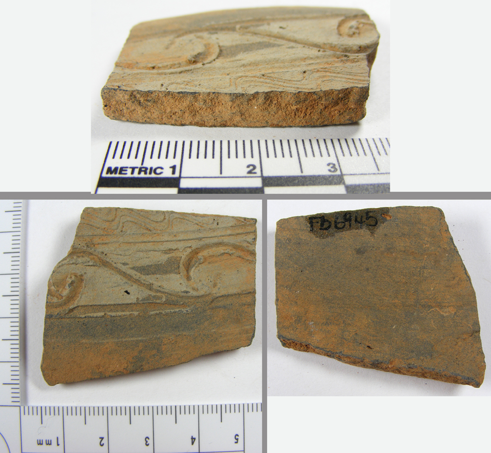 This appears to be a sherd from a large bowl or dish and shows a decorative groove and wavy line pattern and a bold scroll pattern around the circumference, it is pale creamy grey.