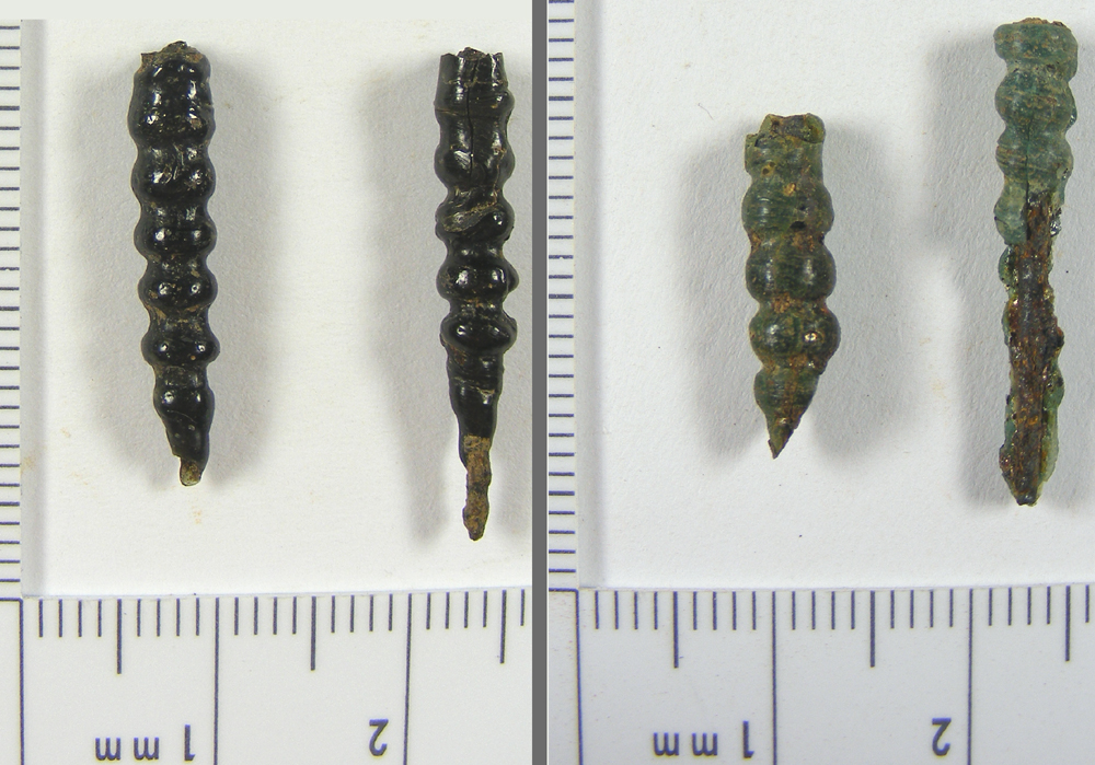 These are pieces of Roman glass, lengths of small segmented (but not separated) beads on a wire, dimishing in size towards one end. It would perhaps be easy to say these were part of a piece of jewellery, maybe a dangly earring or headdress of some kind: and maybe they were.