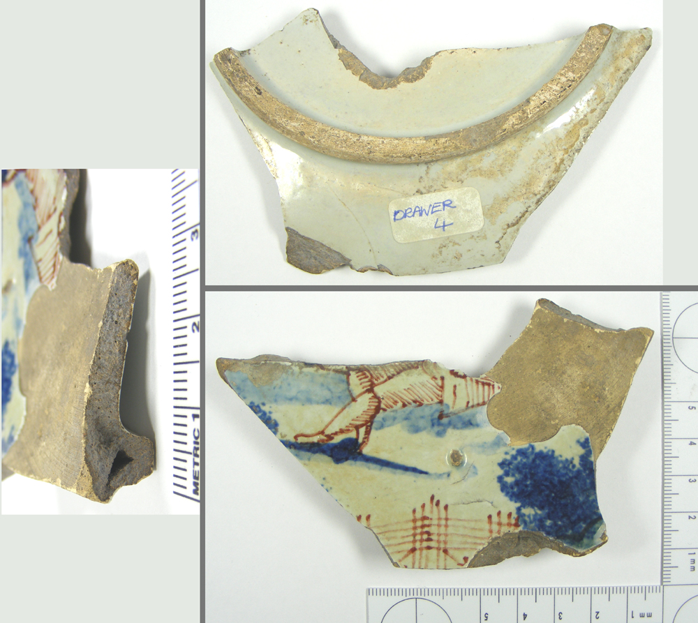 This sherd of a tin-glazed bowl or plate appears to show someone's legs (in red), but what the scene originally was, is a mystery. If you've seen something similar, do let us know.