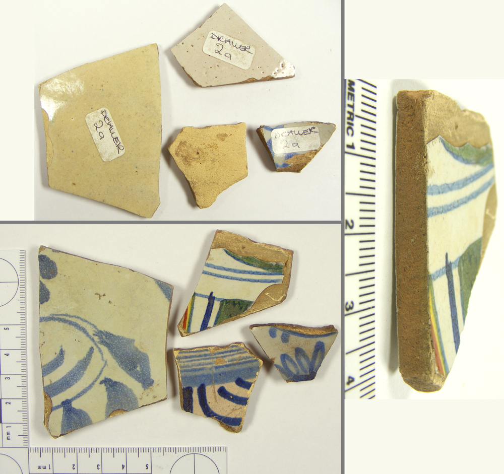 These sherds were among a collection of similar, tin-glazed, blue and white pottery that were donated to Bristol Museum and Art Gallery in 1923. One of the sherds includes decoration in green, yellow and red. They were recovered from the holy well in St Anne's Wood, which was cleaned in 1923 as part of the restoration work in the valley immediately prior to its opening as a public park in 1924.