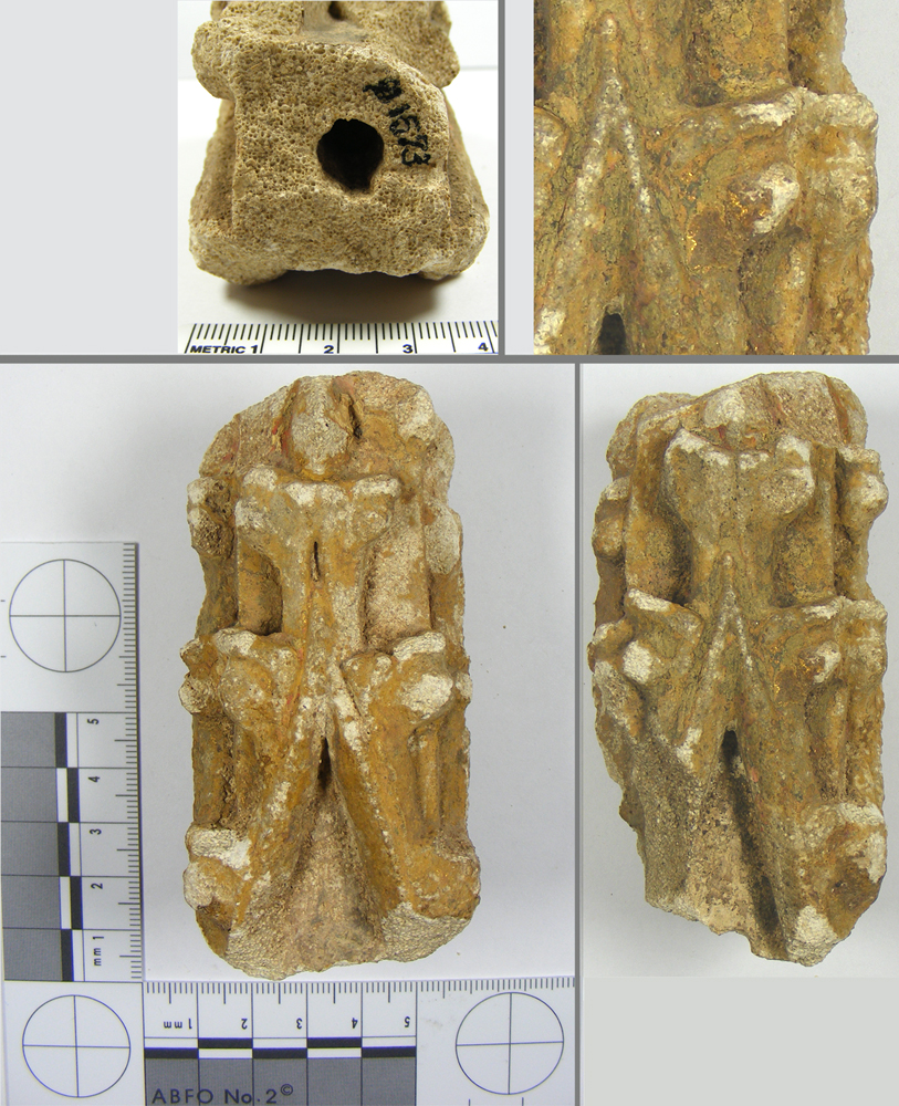 This piece of carved stone (probably Bath stone) was found in a vault by W J Pountney during his excavation of pottery manufacturing remains at the site of the medieval Chapel of St Anne in the Wood, in 1914. He considered it to be a finial or miniature ornamental spire from the chapel's shrine. The design is the same on each of the four faces, and the base is pierced to allow its positioning on a metal spike that would hold it firmly in position.