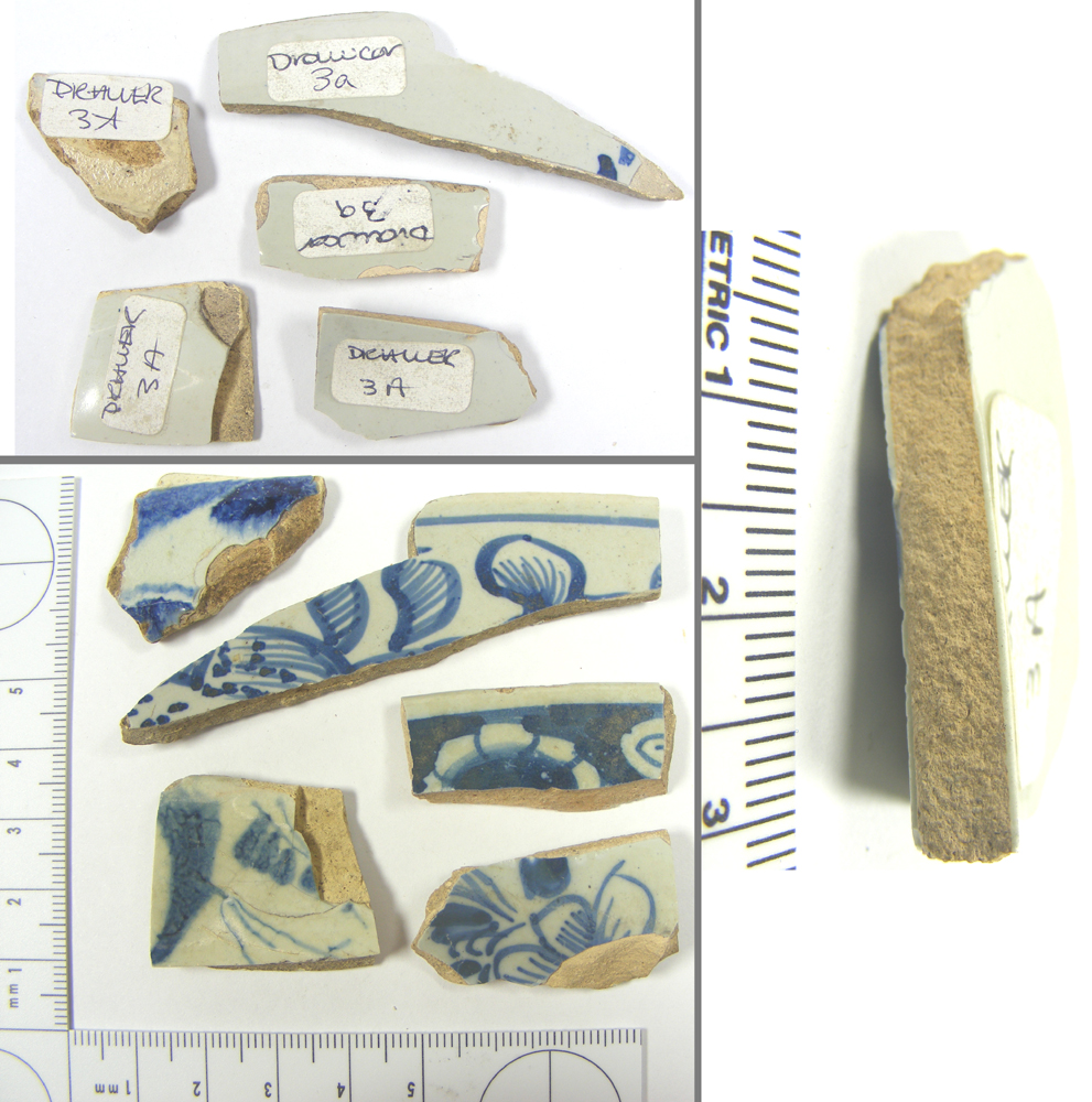 These sherds were among a collection of similar, tin-glazed, blue and white pottery that were donated to Bristol Museum and Art Gallery in 1923. The labels indicate they were found in "St Anne's Well". The holy well in St Anne's Wood was cleaned in 1923 as part of the restoration work in the valley immediately prior to its opening as a public park in 1924, and it is known that at least one other item was donated to the museum at that time (a wooden water pipe, apparently lost in the Bristol Blitz of World War Two).