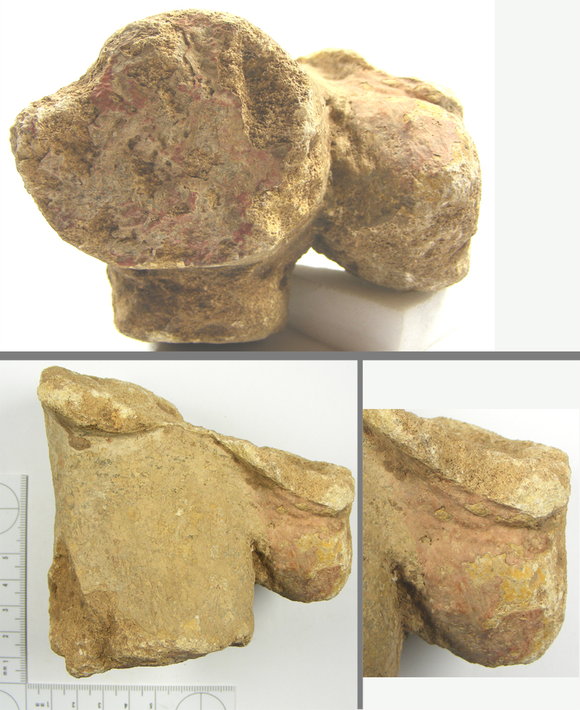 Inspection of the surviving fragments reveals a sinuous design that Pountney thought represented the True Vine (a metaphor for the spiritual body of Christ, the holy church, being part of which a person would flourish and be fruitful, but when cut off, would wither and perish - see the gospel of St John chapter 15). And here we can see the vine painted in flesh tones, with traces of blood red where a branch has been pruned by "the gardener" - God. The bloody stump is the flat surface shown at the bottom of the left-hand of the lower photographs.