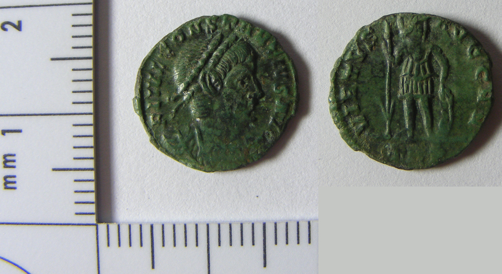 This is a bronze coin of Constantius II, Roman emperor from 337 to 361. The legend on the reverse (VIRTVS AVGG N N) refers to the valour (virtue) of the emperors, while the picture is of a soldier holding a spear, point down, with his other hand resting on top of his shield. This coin was manufactured in the mint at Treveri (Trier, Germany).