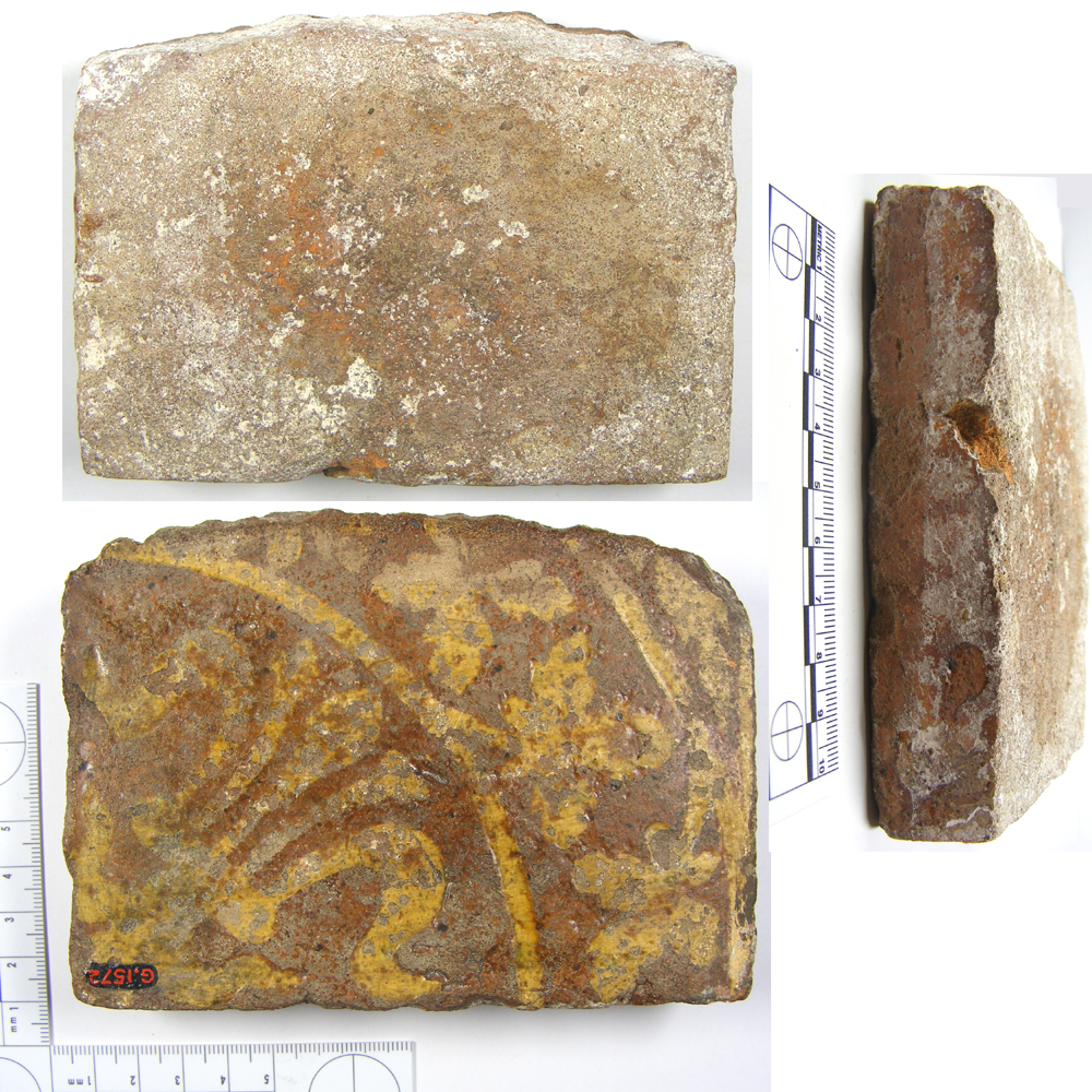 This medieval floor tile was excavated by W J Pountney during his excavation of pottery manufacturing remains at the site of the Chapel of St Anne in the Wood, in 1914.