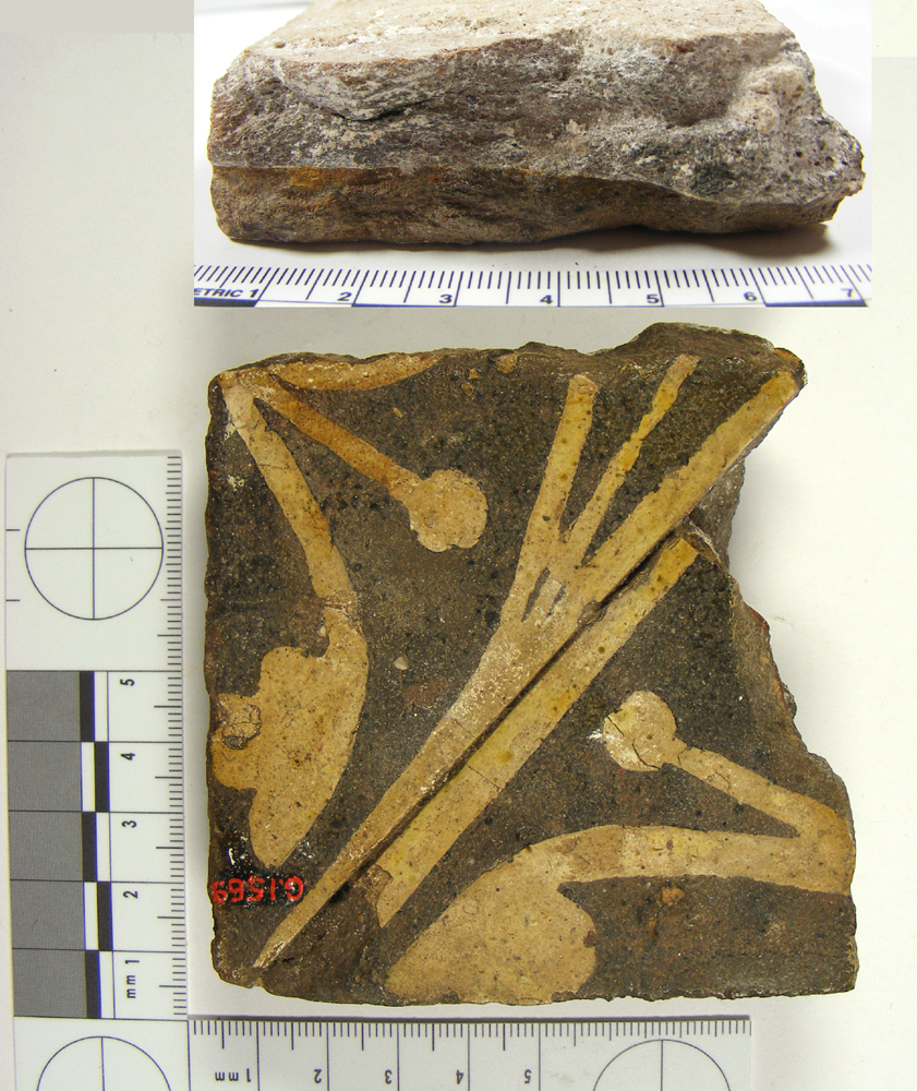 This medieval floor tile was excavated by W J Pountney during his excavation of pottery manufacturing remains at the site of the Chapel of St Anne in the Wood, in 1914. These tiles are triangular, and so arranged as to form a diamond pattern when put together, the original mortar still binds them in this pattern. The design has yet to be identified but may be floral, or perhaps simply abstract.