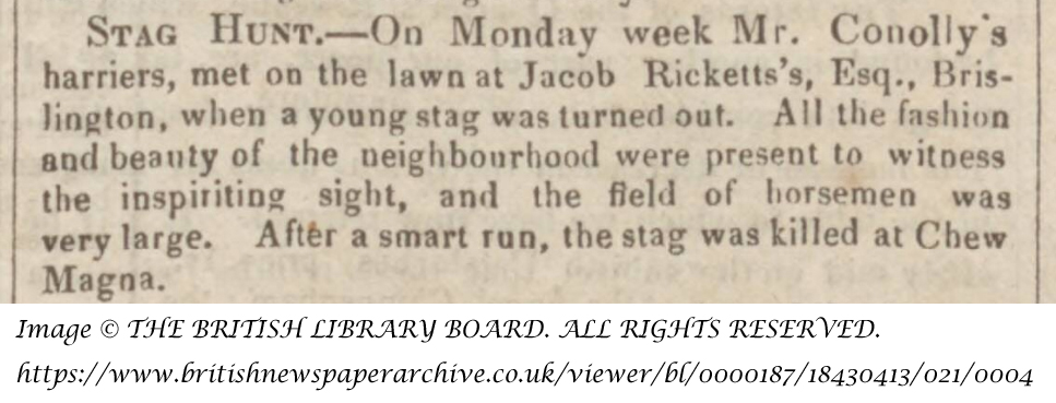 "STAG HUNT.-On Monday week Mr. Conolly's harriers, met on the lawn at Jacob Ricketts's, Esq., Brislington, when a young stag was turned out. All the fashion and beauty of the neighbourhood were present to witness the inspiring sight, and the field of horsemen was very large. After a smart run, the stag was killed at Chew Magna."