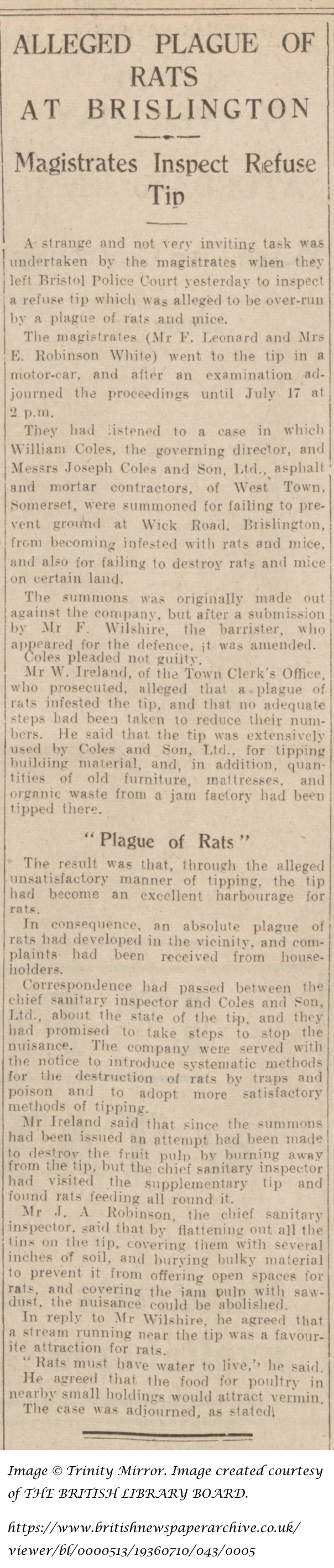 A strange and not very inviting task was undertaken by the magistrates when they left Bristol police Court yesterday to inspect a refuse tip which was alleged to be over-run by plague of rats and mice.