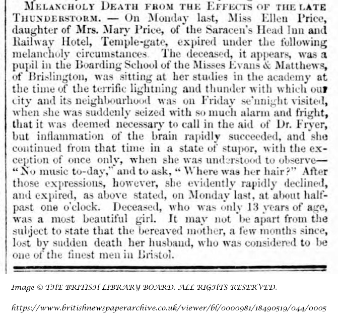 "MELANCHOLY DEATH FROM THE EFFECTS OF THE LATE THUNDERSTORM. - On Monday last, Miss Ellen Price, daughter of Mrs. Mary Price, of the Saracen's Head Inn and Railway Hotel, Temple-gate, expired under the following melancholy circumstances. The deceased, it appears, was a pupil in the Boarding School of the Misses Evans & Matthews, of Brislington, was sitting at her studies in the academy at the time of the terrific lightning and thunder with which our city and its neighbourhood was on Friday se'nnight visited, when she was suddenly seized with so much alarm and fright, that it was deemed necessary to call in the aid of Dr. Fryer, but inflammation of the brain rapidly succeeded, and she continued from that time in a state of stupor, with the exception of once only, when she was understood to observe - "No music to-day," and to ask, "Where was her hair?" After those expressions, however, she evidently rapidly declined, and expired, as above stated, on Monday last, at about half-past one o'clock. Deceased, who was only 13 years of age, was a most beautiful girl. It may not be apart from the subject to state that the bereaved mother, a few months since, lost by sudden death her husband, who was considered to be one of the finest men in Bristol."