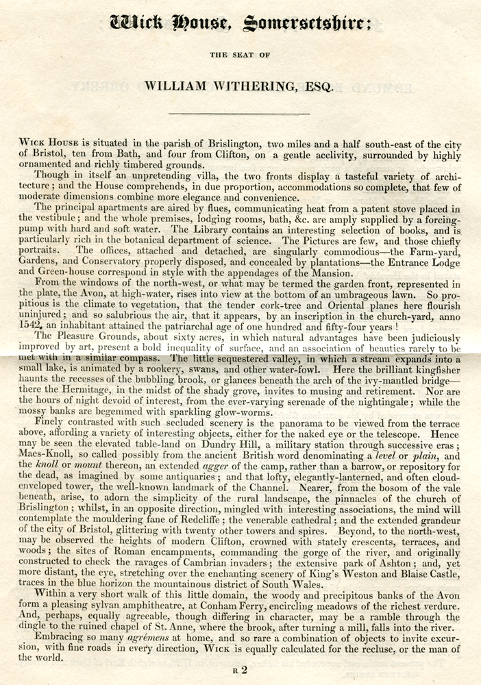 "Wick House is situated in the Parish of Brislington, two miles and a half south-east of the city of Bristol, ten from Bath, and four from Clifton, on a gentle acclivity, surrounded by highly ornamented and richly timbered grounds.