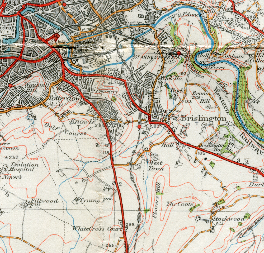 This Ordnance Survey map shows Brislington as it was some time before 1937. Ordnance survey maps can be a bit confusing because they didn't update everything all at once, for example this map shows boundary changes up until 1939 (which doesn't affect Brislington as the last remaining part of the Somerset village was absorbed into the city of Bristol in 1933).