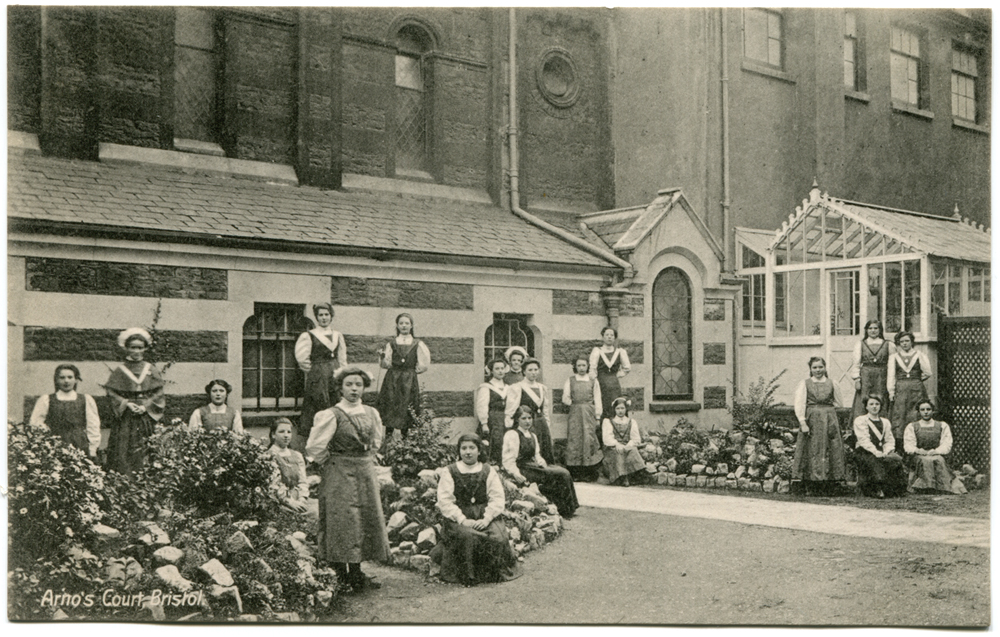 This photograph was taken inside the cloisters of what was (according to the 1911 Census) the "Reformatory School for Girls, Arno's Court". Twenty women and girls are arranged individually and in small clusters among flowerbeds, with a conservatory and tall buildings behind them. The site is now enclosed and occupied by the restaurant of the Arno's Manor Hotel.