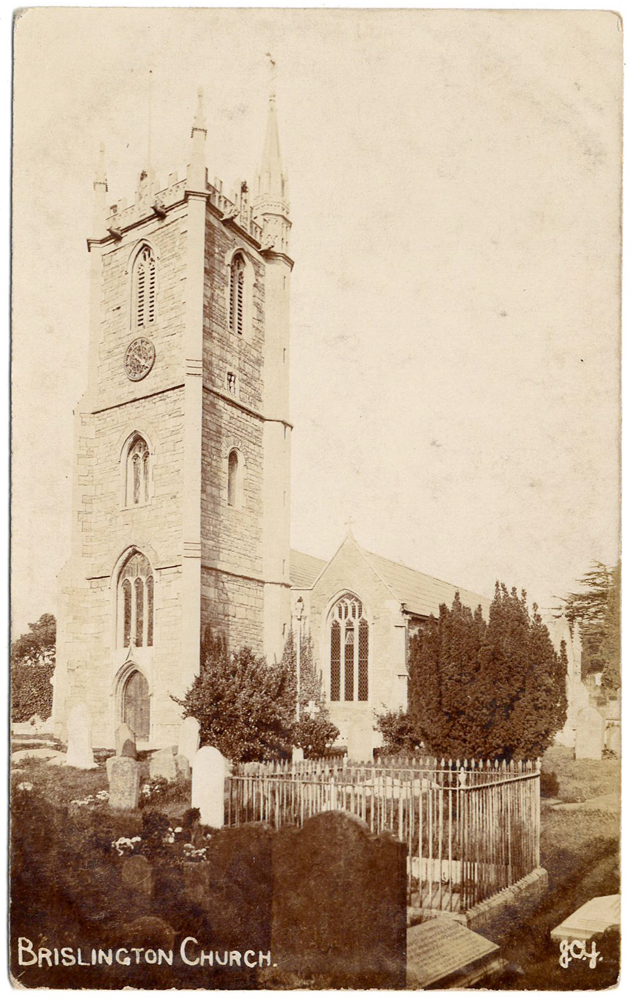 Postcard photographed and published by Jesse Caleb Young. The front carries the title "BRISLINGTON CHURCH." and his initials "j.c.y.".