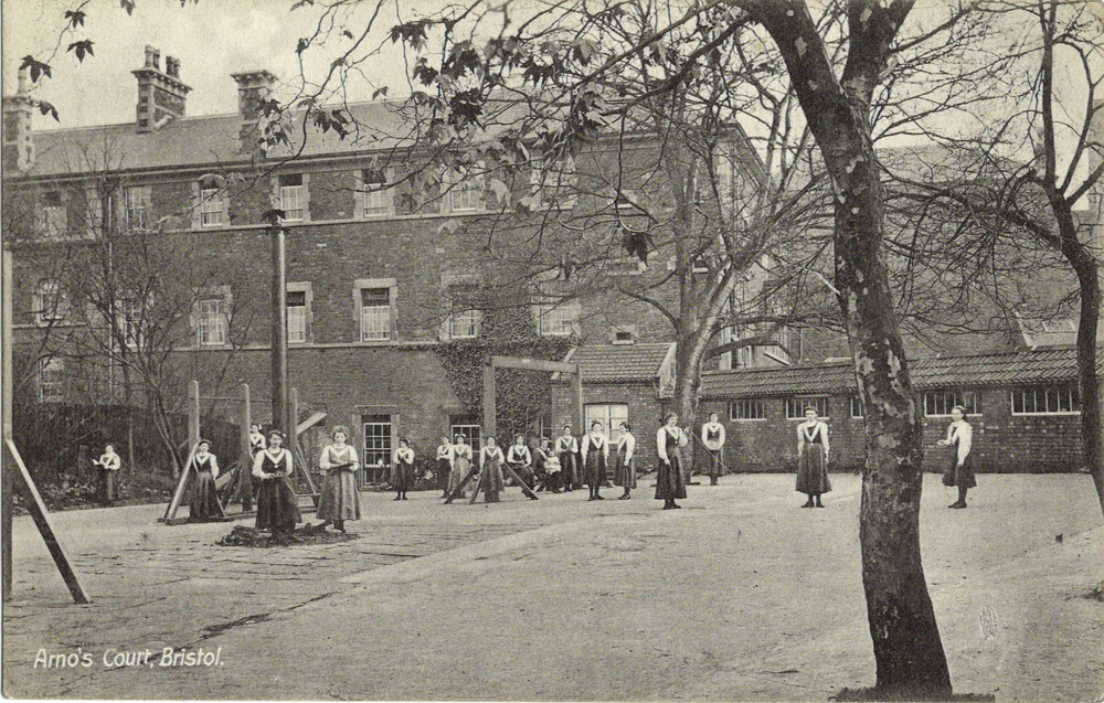 This picture shows the exterior of buildings at the back of the convent and "Reformatory School for Girls, Arno's Court" (according to the 1911 Census). The large building disappearing to the left can still be seen from the A4 Bath Road (the left-hand part of it is closest to the road) in the grounds of what is now Arnos Manor Hotel. The land boundaries have changed since the photographer took this picture - they would have been standing in what is now part of the Here complex.
