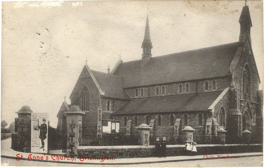 The picture published in this postcard was photographed by William Albert Winchester, and titled "St Anne's Church, Brislington." Between the gate piers at the entrance to the church (at the junction of Salisbury Road and Langton Road), is a large placard advertising "The Old Castle Carnival" at Arnos Castle (the only building from that complex still surviving in Brislington is the Black Castle public house). The earliest known date relating to this picture was a postcard postmarked 15 Feb 1909.